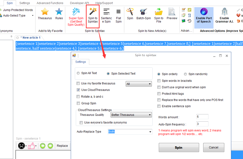 Also when using the spin tree sometimes when you have a senetneces selected and then add a new one to it instead of just adding it to the senentence it attaches it within another spin tax creating {{ messign up everything.