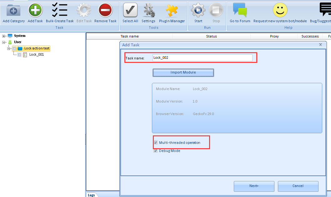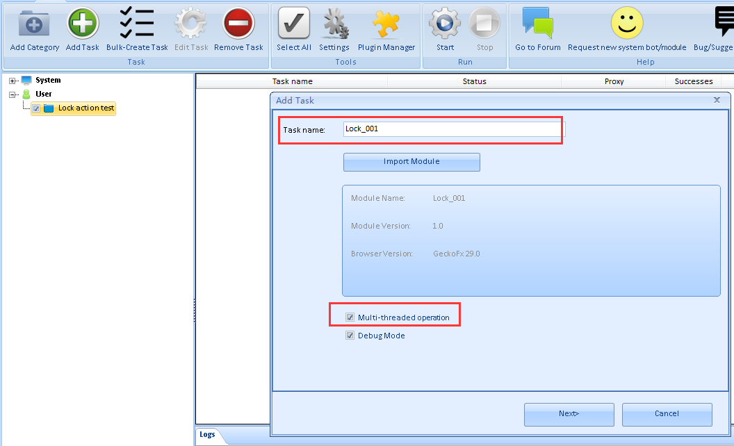 Lock action is to lock the running threads, and only allow one thread to run these actions below the lock action per time when you run your module with multiple threads. So this action solved the previous problem which cannot run the module with multiple threads when there are these actions in your module: Upload File, Mouse Emulation(web), KeyStrokes Emulation, Flash Action, New Captcha.