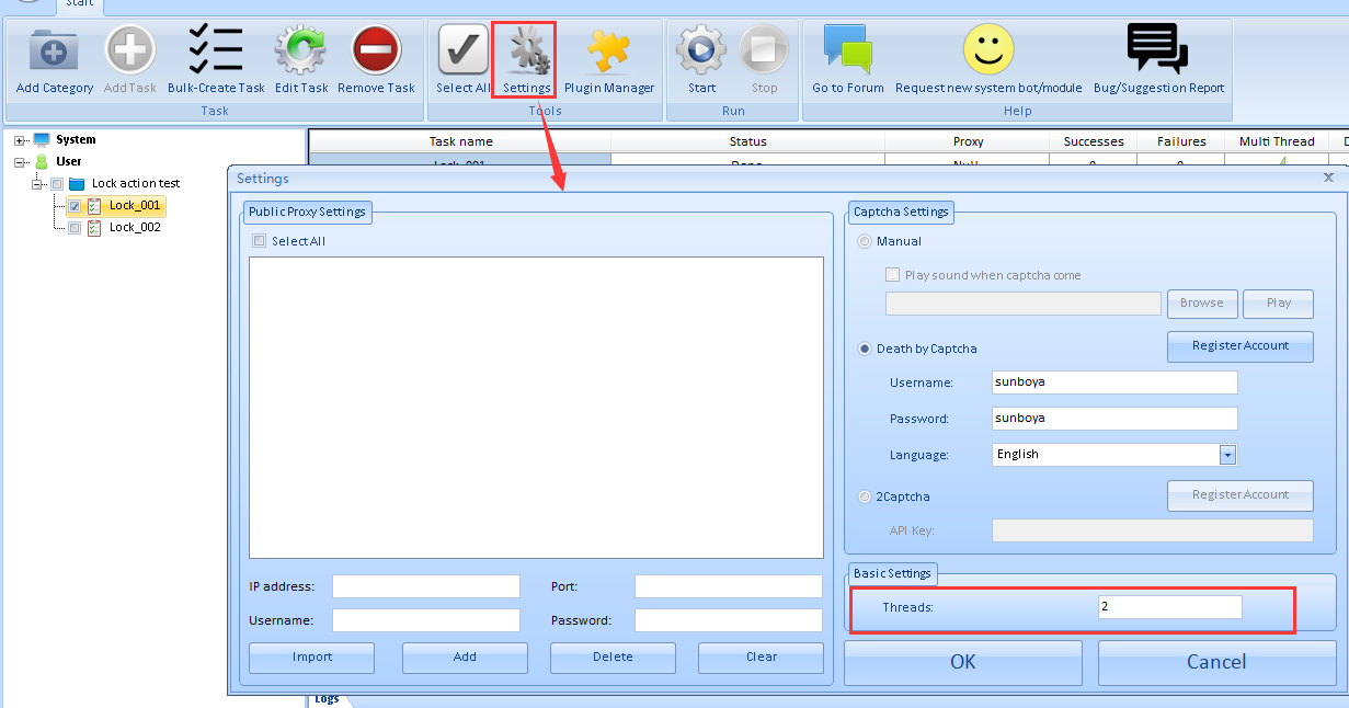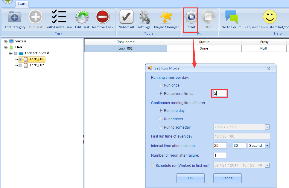 First, let’s check the task Lock_001, and set the running threads to 2. Click Start button, and set the running times to 2.