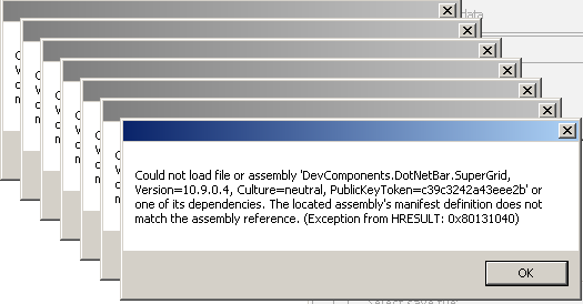 EDIT: Looks to be caused by DevComponents.DotNetBar.SuperGrid.dll as I replaced the one from the compiled bot from one here - http://www.whitehatbox.com/bbs/BBSPost?postid=5300#.WVRb0YTyvbg from the bottom post and it allowed the bot to open but when I goto run it I get this error