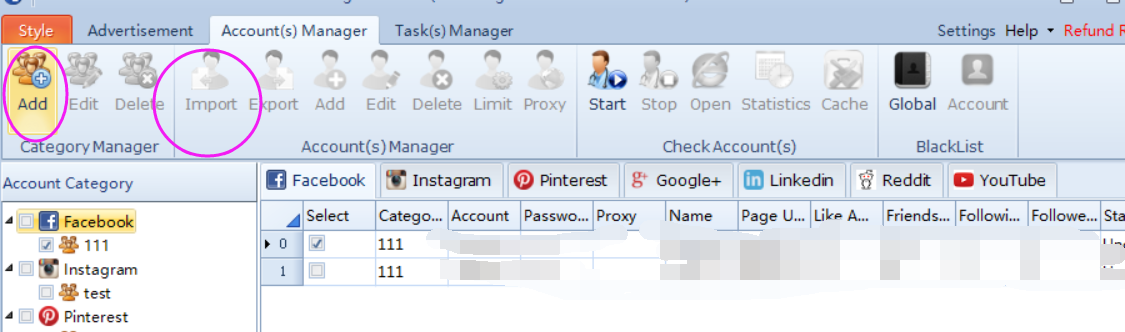 FollowingLike supports import accounts function too. You can find the Import function in AccountManager tab toolbar.