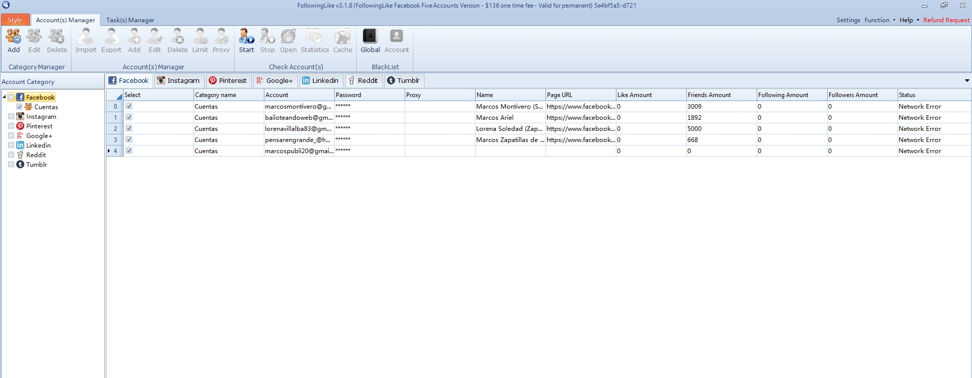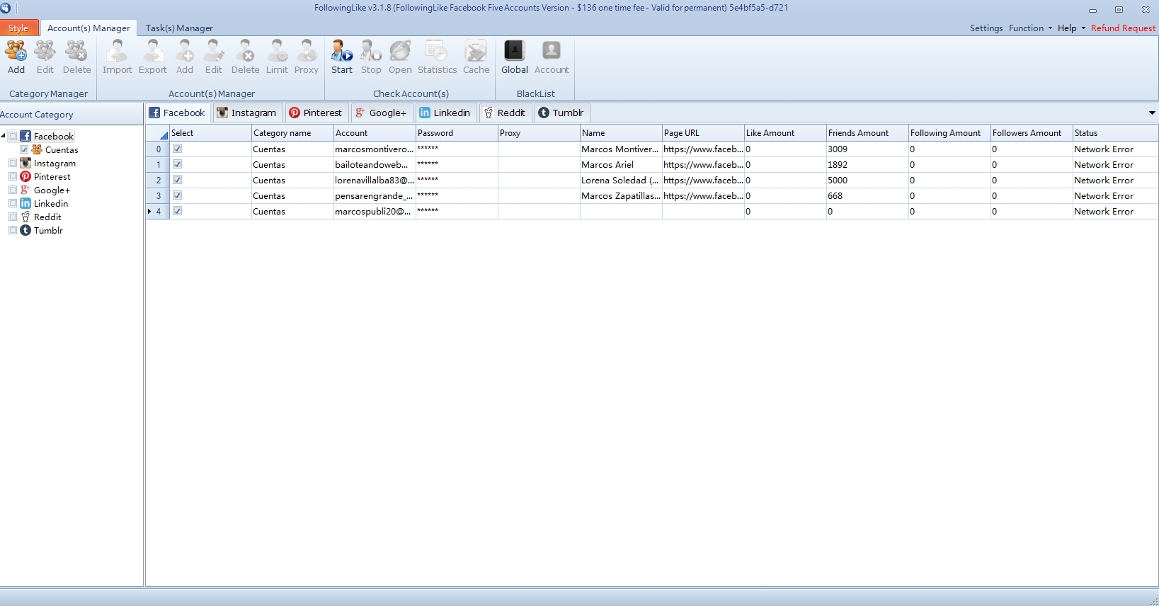 From the screenshot you share to me, software successfully scrapes the number of friends you have. Which means it can work. About why the status is network, it should be related to your current network. So software does not update the status soon.
